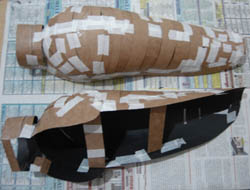 Depois de feito os moldes em papel cartão e fita crepe é hora de reforçar as estruturas. Essa parte é feita com a aplicação de tiras de jornal com cola branca dissolvida em um pouco de água.